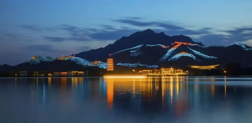 璀璨燈光秀:十餘座山脈燈光璀璨,塔影倒映湖中如夢(mèng)似幻。